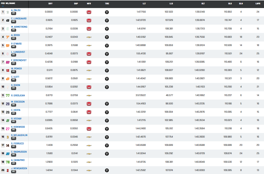 Los cincos primeros fueron los pilotos de Arrow McLaren, hablamos de Alexander Rossi que finalizó a +0.2407 y quinto finalizó el mexicano, Pato O´Ward con un tiempo de 1:39.9124. Por otro lado el clasificador de los diez mejores quedó con Lundqvist a +0.4048, Rosenqvist a +0.4236, Power a +0.5111, Callum Ilott a +0.5672 y décimo concluyó Scott Dixon a +0.5954.