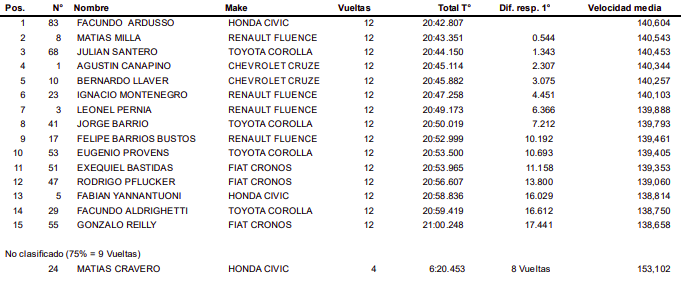 Ardusso se vio beneficiado por la grilla invertida, donde largó el en el primer puestos y desde ahí no soltó la punta en la divisional mayor. Ya que el ritmo del auto y además los problemas que daba tras estar de el hizo que se haga difícil acercarse.