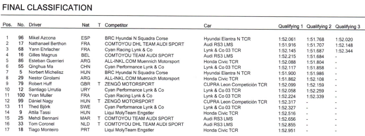 Siendo el último en salir a dar una vuelta, Yann Ehrlacher con el Lynk & Co logró marcar 1:52.344 a +324 de diferencia sobre el poleman, quedando al final el francés con el tercer puesto.