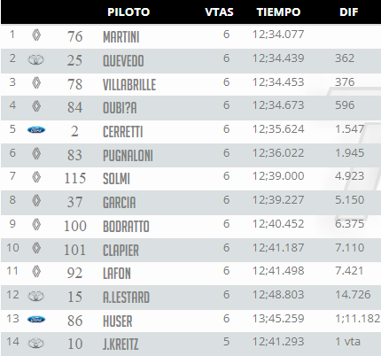 Entrando en la última vuelta Martini se defendía sobre Oubiña que se pasaba en la segunda curva quedaba en el cuarto lugar. Quevedo por su lado se metía segundo y cerca de Martini.