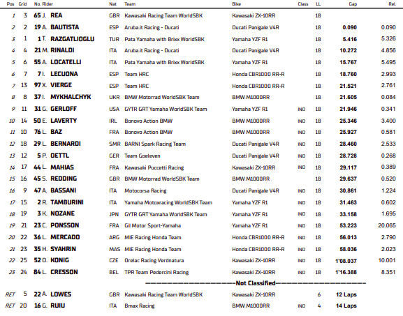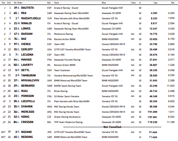 El corredor español de Ducati peleo al principio con Rea, pero luego el ritmo de su moto los dejó atrás a sus rivales. La principal pelea lo tuvo al campeón Razgatlioglu con Rinaldi. Ya que ambos buscaron el 3er puesto con toda una pelea.