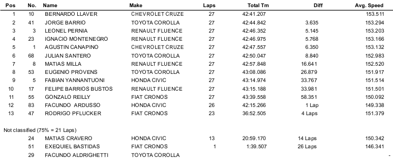 Al final Bernardo Llaver lograba vencer por segunda vez en el 2022 y sumaba su triunfo Nro.8 , igualando el récord de Zanatta y Girolami. Seguido en el podio con Barrio (Toyota) y Pernia (Renault).