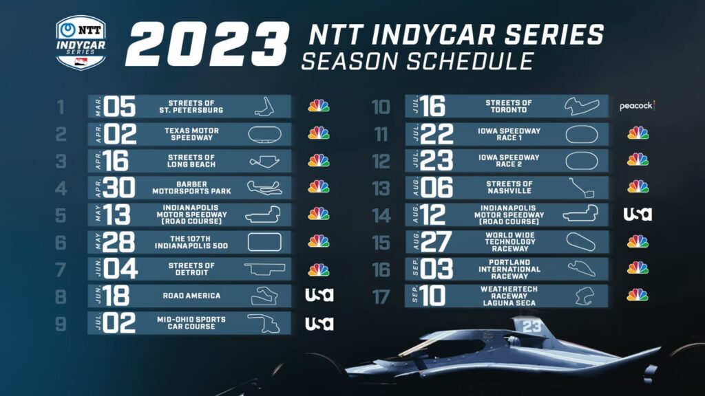 Ya para el inicio de competencia seguirán por decimotercera en las calles de St. Petersburg el domingo cinco de marzo. Siguiendo con los clásicos de cada fecha. Mientras que la fecha más importante del año las 500 millas de Indianápolis ya tiene fechas.