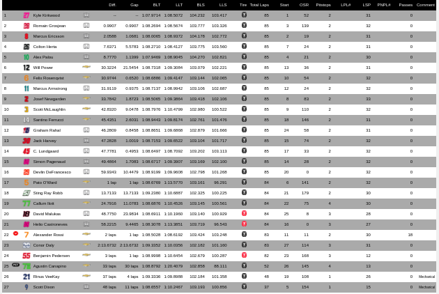 Pato O’Ward por su lado lograba avanzar sobre Alex Palou para entrar al quinto lugar, mientras que Newgarden avanzaba sobre los dos. Scott Dixon mientas tanto no logró avanzar.