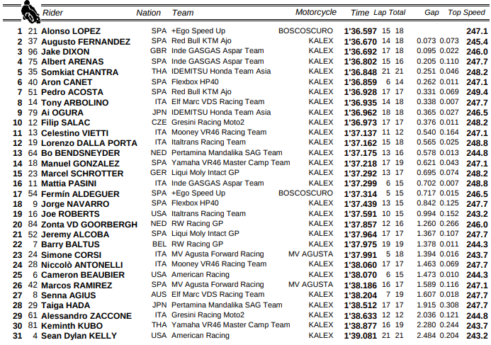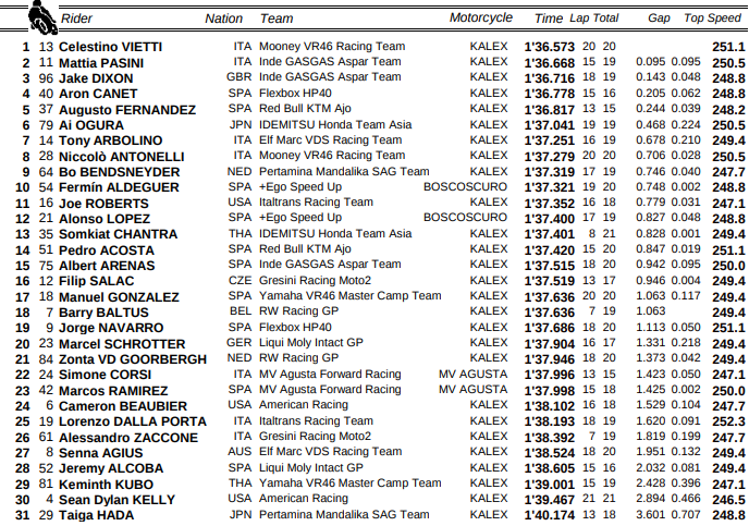Mientras que desde el segundo lugar fue Mattia Pasini con una mínima diferencia de 95 centésimas, tras haber cronometrado 1:36.668, seguido en el tercer puesto con Jake Dixon con la GASGAS Aspar Team a +143 décimas.