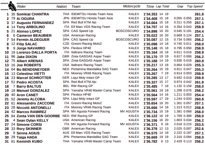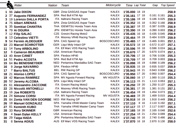 Mientras que desde el segundo puesto tuvo al español Augusto Fernandez que con la KTM Red Bull Ajo ha hecho un buen tiempo de 1:35.161 a +161 décimas sobre Dixon. Y el top tres por su lado dejó a Lorenzo Dalla Porta tras cronometrar 1:35.186.