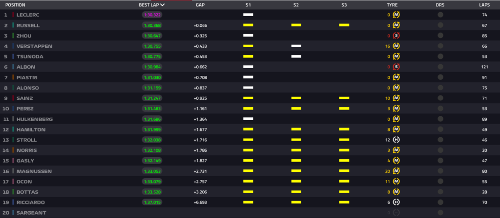 El clasificador del top diez cerró con Alexander Albon a +662, Oscar Piastri a +708, Fernando Alonso a +837, Carlos Sainz a +925 y décimo cerró Sergio Pérez a +1.161.