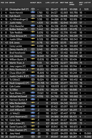 Por otro lado el top tres de la prueba quedó en manos de Kevin Harvick junto Kyle Busch tras una estupenda y silenciosa competencia. Aj Allmendinger y Justin Haley completaron el clasificador de los cincos mejores.