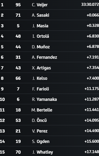 Gran competencia de la divisional menor del MotoGP, donde ha tenido la victoria del piloto de Países Bajos Collin Veijer que consiguió su primer triunfo. Sasaki y Masia fueron los escoltas.