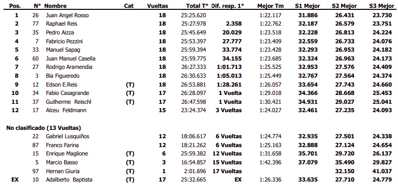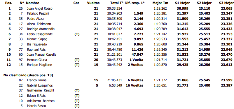 Al comenzar la competencia pudo separarse con un buen ritmo sobre Raphael Reis, mientras que en el tercer lugar tenía una lucha de Pedro Aizza con Alceu Feldmann y Fabricio Pezzini. Pero que al pasar las vueltas Aizza supo imponerse sobre los experimentados de la categoría.