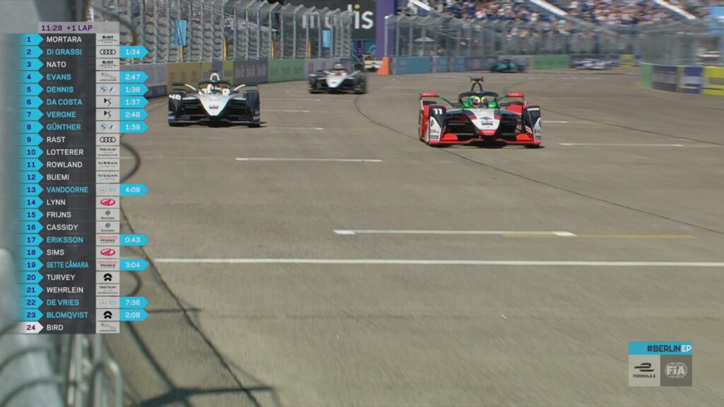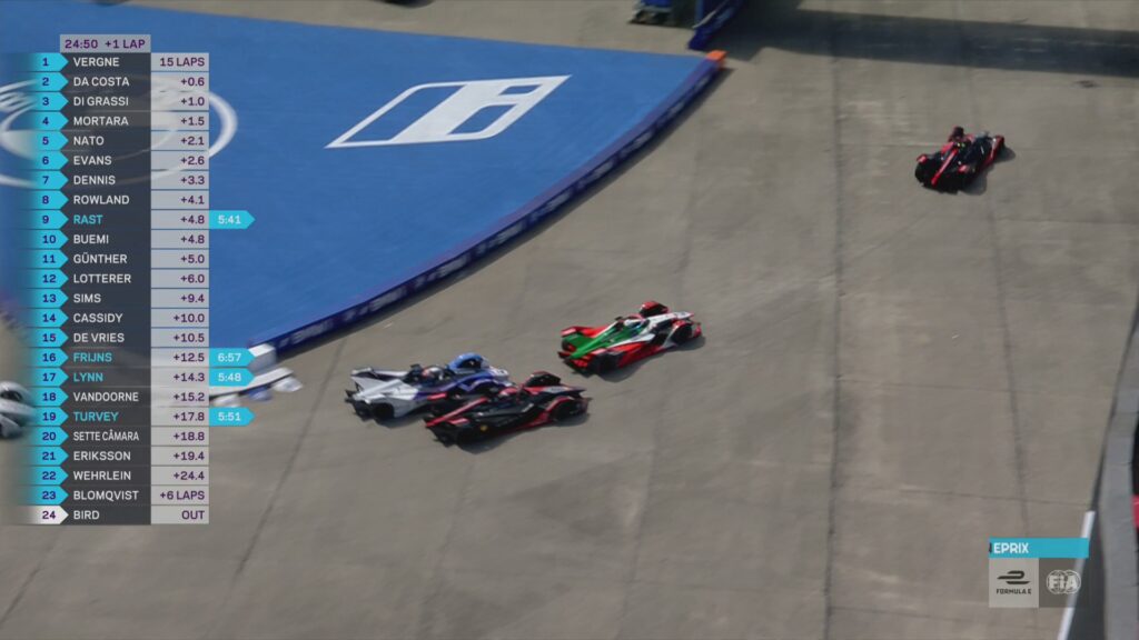 Después de que los Audi golpearan el frente, Edoardo Mortara y Norman Nato saltaron al par a través de su impulso de modo ataque. Da Costa se deslizó a un eventual sexto y Vergne séptimo, mientras que la carga de Rast no duraría ya que cayó al noveno.
