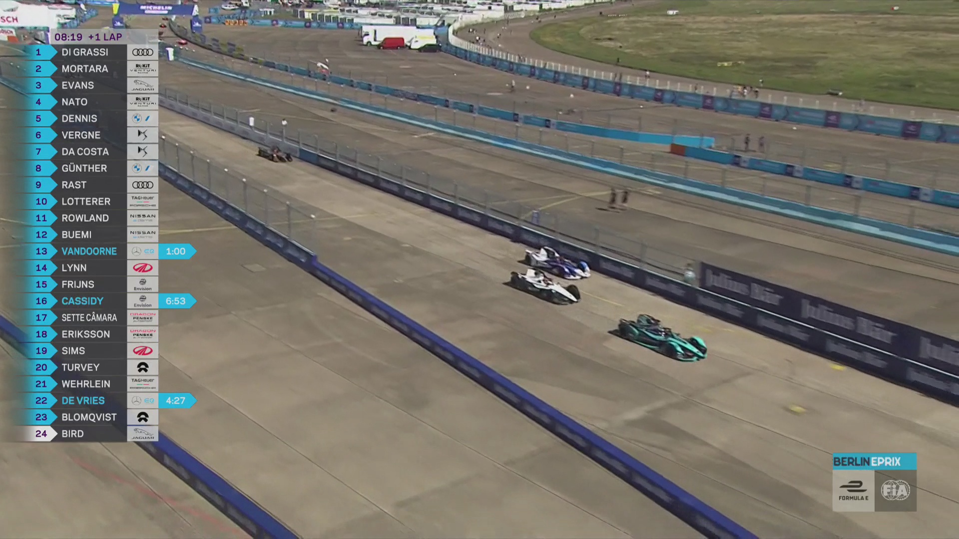 Después de que los Audi golpearan el frente, Edoardo Mortara y Norman Nato saltaron al par a través de su impulso de modo ataque. Da Costa se deslizó a un eventual sexto y Vergne séptimo, mientras que la carga de Rast no duraría ya que cayó al noveno.