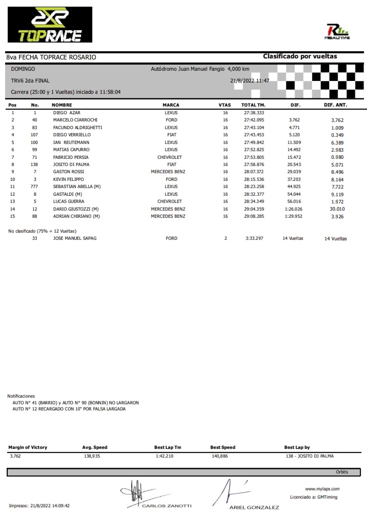 Diego Azar por su lado se quedaba con una nueva victoria y podía sacar más brecha sobre el segundo en el campeonato. El top 3 lo completaba con Ciarrocchi y Aldrighetti.