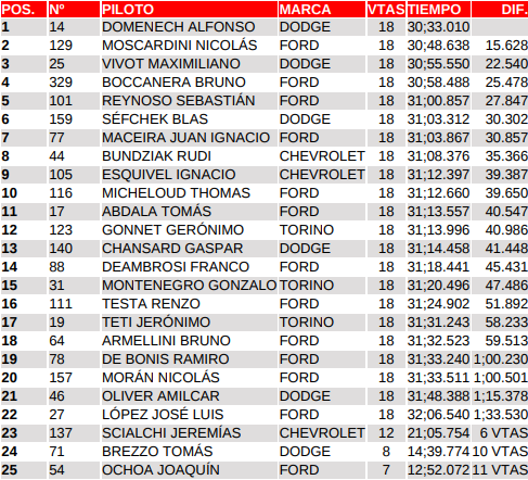La victoria por su lado pasaba de lado para Domenech. Ya que salía del auto con una gran emoción tras la perdida de un amigo en la semana terminaba dedicándoselo en lo más alto del podio. El top tres por su lado quedaba con Moscardini y Vivot.