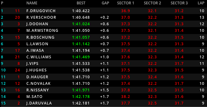 Marcus Armstrong con el Hitech Racing y Ralph Boschung del Campos Racing culminaron dentro de los cinco mejores de la clasificación. Donde respectivamente hicieron 1:41.050 y 1:41.057.