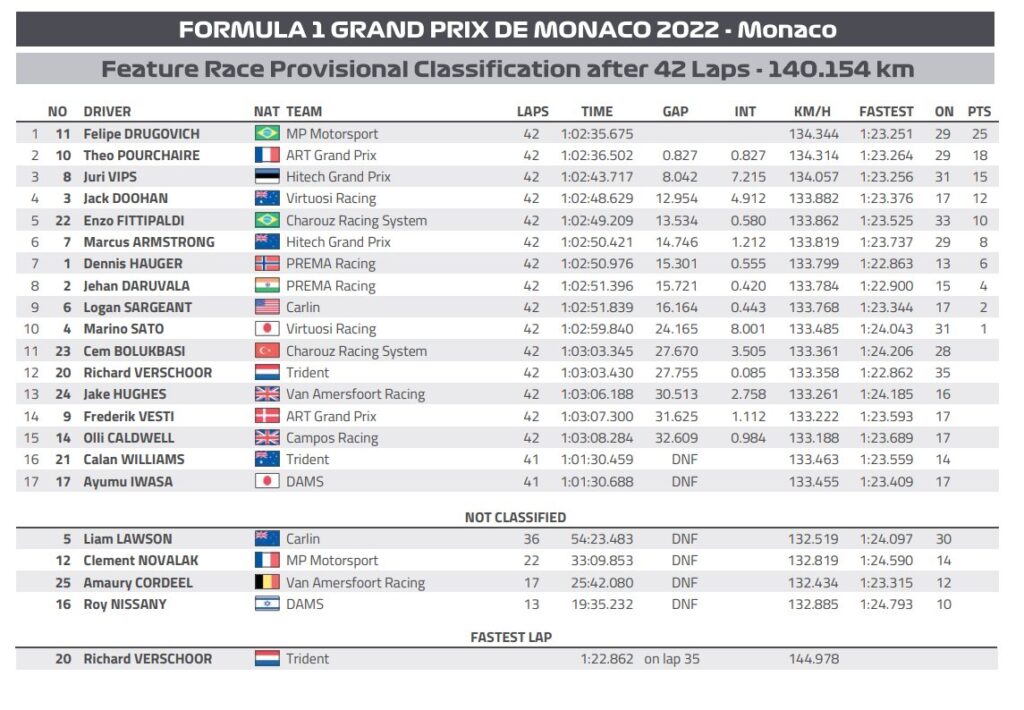 El segundo de la carrera Théo Pourchaire, que logró aguantar tras haber salido 2do con el ART Grand Prix en la clasificación pudo cuidarse. Luego aguanto con el monoplaza sobre Jack Doohan al principio de la carrera. Además estuvo cerca de pelear el puesto a Drugovich, pero el ritmo y la pista angosta no ayudo.