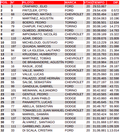 Desde el décimo sexto giro, Fritzler le achicaba las diferencias a Elio Craparo por el primer lugar, pero este se mantenía. Al final la carrera quedaría en manos de Craparo, seguido por Otto y en el último escalón del podio a Canapino.