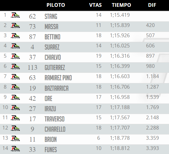 En el segundo puesto tuvo a Brian Massa con el monoplaza del Aimar Motorsport con 420 décimas, luego de meter 1:15.839. El tercer lugar cerró con Thiago Bettino, el joven piloto del ESG Competición cerró con 1:15.926 a medio segundo de Stang.