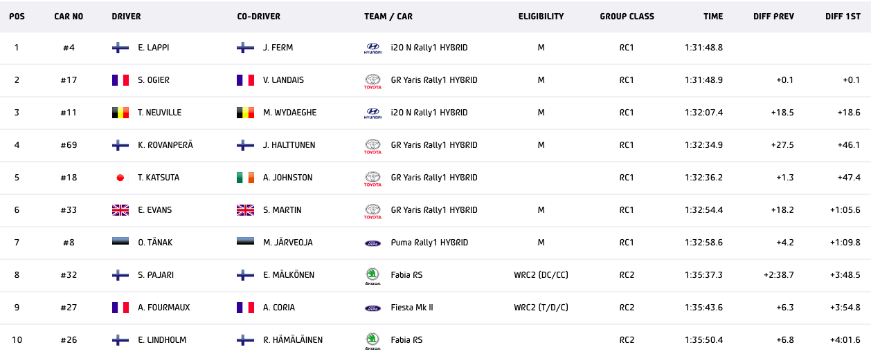 El top cinco de la prueba por su lado cerró con el vigente campeón, Kalle Rovanperä con +46.1 y quinto concluyó Takamoto Katsuta con un tiempo de 1:32:36.2.