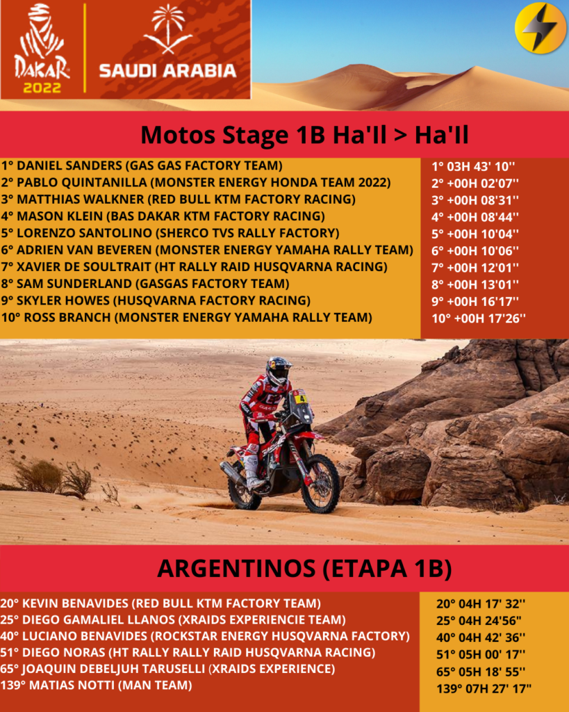 La etapa 1B tuvo a Daniel Sanders y Laisvydas Kancius como los ganadores de motos y quads, tras los problemas del roadbook en algunos competidores.