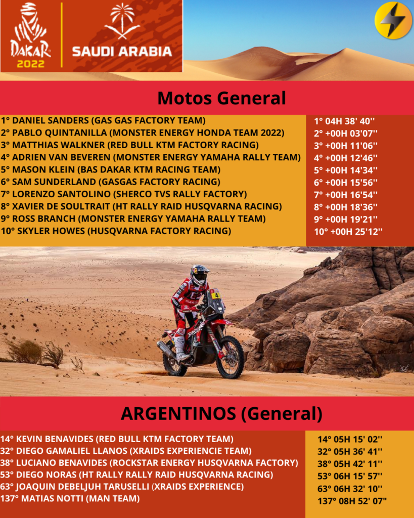 Por el lado del top 5 tuvo completado por Mason Klein de BAS Dakar a +8’44» del líder y en el quinto lugar el italiano Lorenzo Santolino con la moto de Sherco a +10’04».