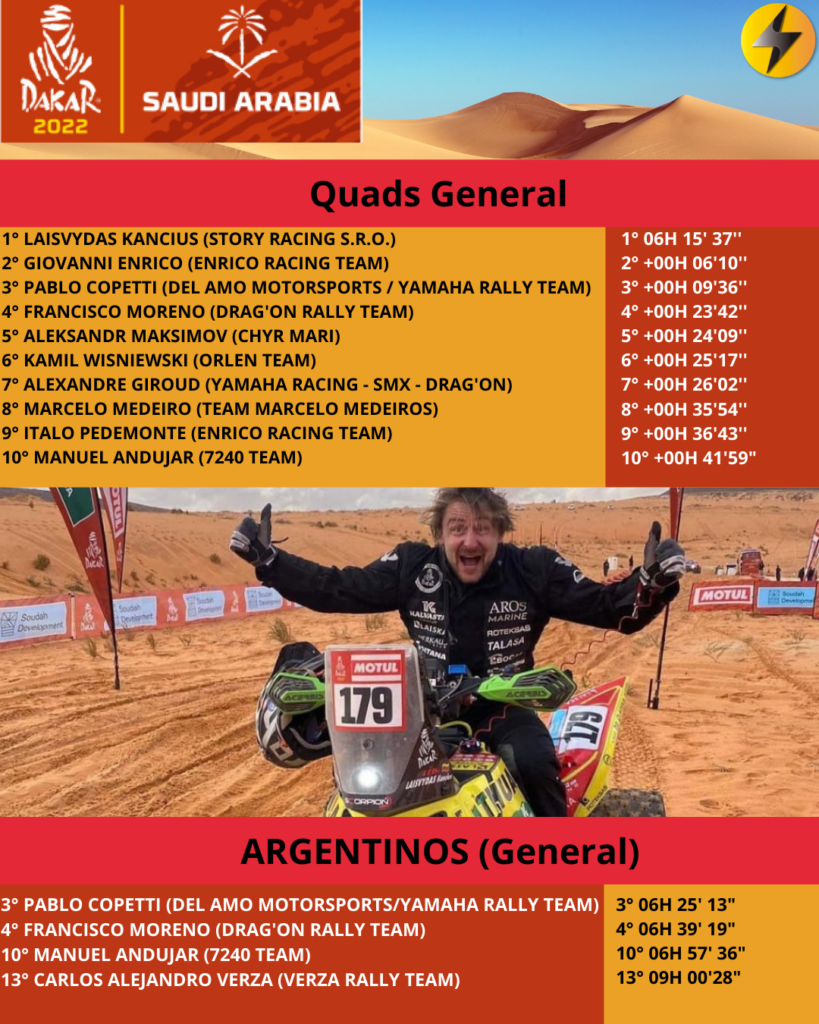 La gran sorpresa fue que el argentino, Manuel Andujar, uno de los que lideraba la prueba de Ha’il a Ha’il tuvo varios problemas mecánicos con el quad del equipo 7240 quedando décimo. Esto comentaba en sus redes sociales: «Que día frustrante y triste 😤, venia ganando hasta el km 60 de la especial donde mi Cuatri empezó a fallar, tuve que parar 5 veces en la etapa a limpiar inyector para poder llegar al final. De esta manera la punta de la carrera se me alejo 1hs que es muchísimo, lo bueno y positivo es que no está nada dicho hasta que se baje la bandera final, mañana será otro día. 1 adentro faltan 11 más».