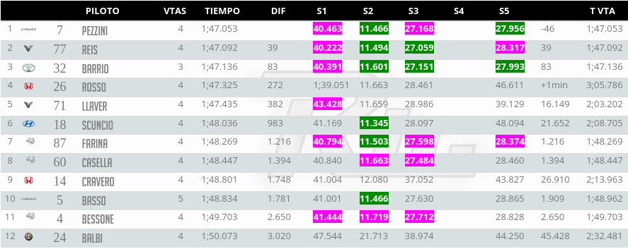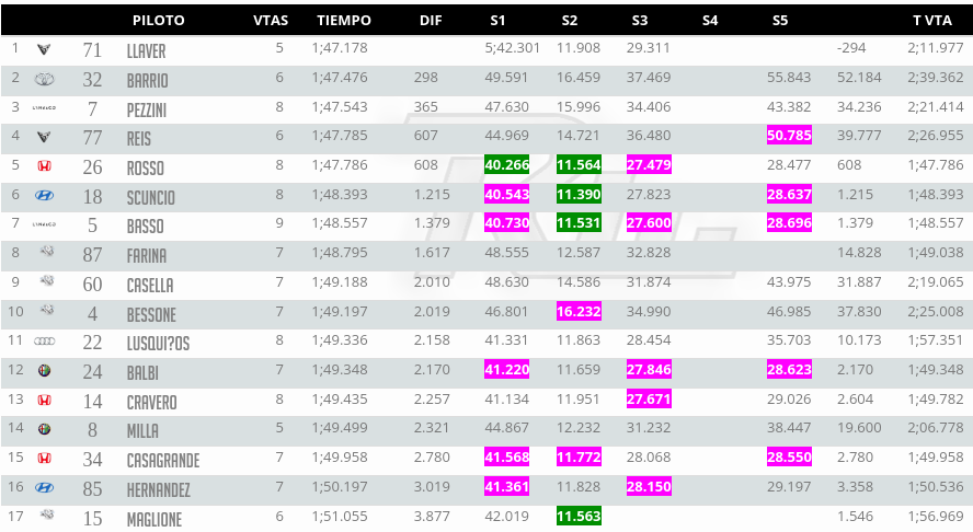 El top cinco de dicha prueba cerró con Juan Ángel Rosso con el Honda Civic FK7 del Squadra Martino tras haber hecho 1:47.325 y quinto quedó el mendocino, Bernardo Llaver a +382.