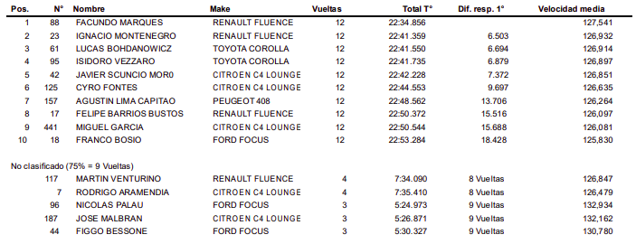 Facundo Marquez por su lado lograba sacar una ventaja significativa para obtener el triunfo. Por atrás aparecían los ataques de Montenegro sobre Vezzaro, pero por una rotura de la dirección hidráulica perdía posiciones. Esto lo aprovechaban el Fluence N°23 y el Corolla N°61°.