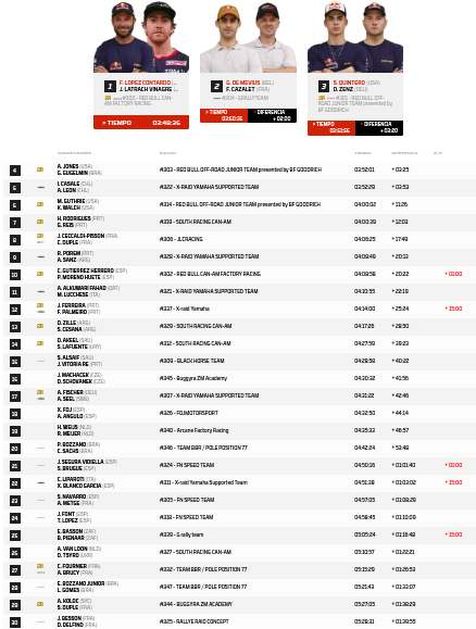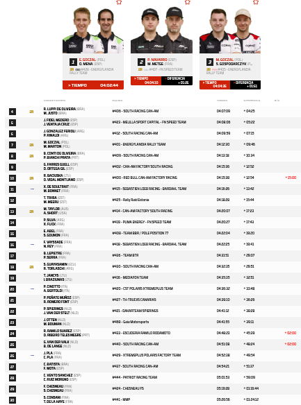 Por el lado del top tres de la competencia ha quedado en manos de Pau Navarro junto a Michael Metge a +01:26 y tercero la dupla de polacos, Michal Goczal con Szymon Gospodarczyk a +01:51.