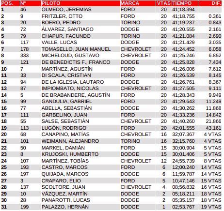 Por tercera vez salía el Pace Car y dejaba a todos los pilotos juntos. Recién tendría su arranque en la vuelta 18 nuevamente con Olmedo tomando la punta, mientras que Álvarez buscaba el 3er lugar por afuera, pero no podía.