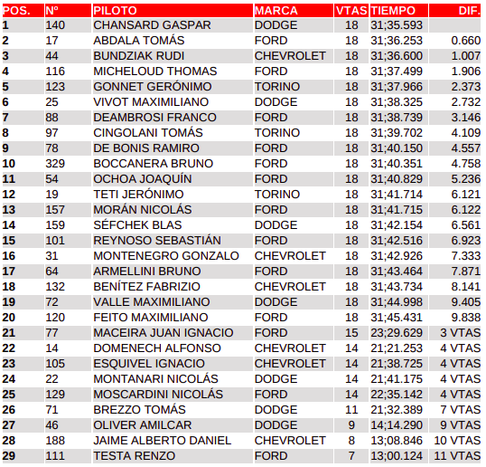 El auto de seguridad ingresaba y tenía a Brezzo ingresando a boxes por inconvenientes. En la vuelta 17 se reanudaba la carrera, ya que se agregaba dos vueltas, pero Gaspar Chansard se quedaba con la victoria, seguido por Abdala y Bundziak.