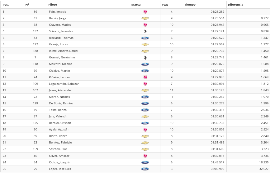 El top cinco de la prueba ha cerrado con Jeremías Scialchi con el Torino del Trotta Racing con 1:29.121 y en el quinto lugar tuvo a Thomas Ricciardi con el Ford del RUS Med Team a +1.247.