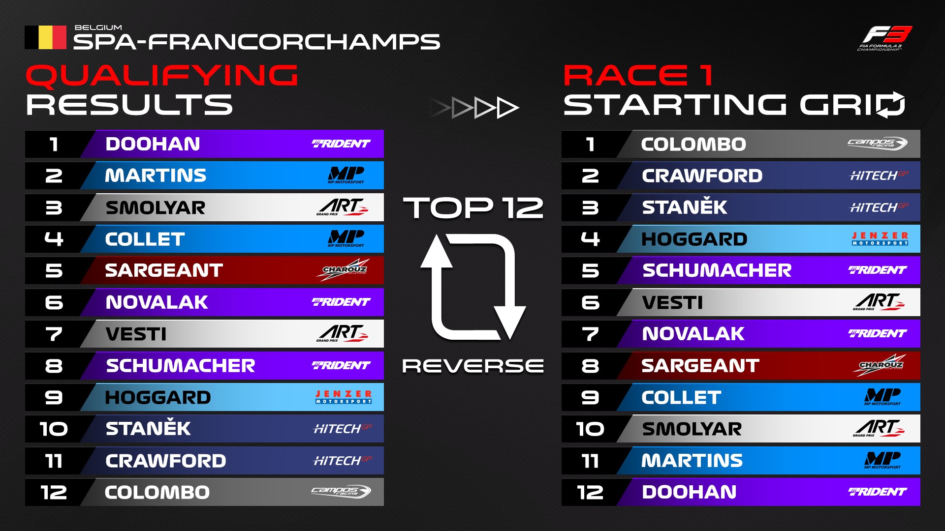 Spa Francorchamps tuvo a Doohan como el más rápido de la F3 luego de haber hecho un tiempo de 2:21.953 en el circuito de 7.003 kilómetros. Mientras que lo siguieron Victor Martins y Alex Smolyar desde el segundo y tercer puesto.