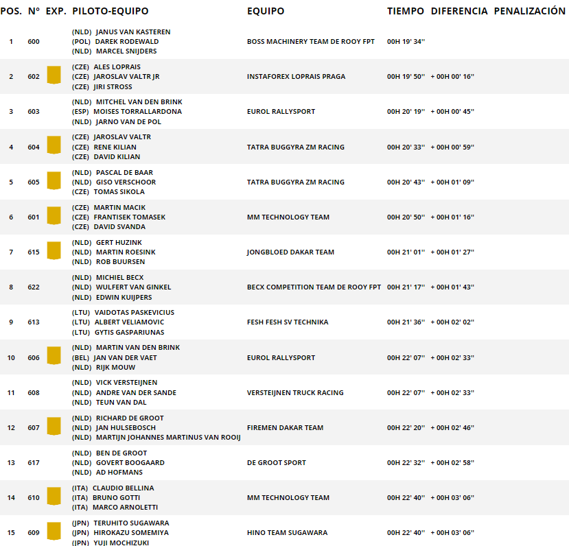 Segundo y consiguiendo achicar las diferencias con sus rivales fueron los de Republica Checa. Hablamos de Ales Loprais, Jaroslav Valtr Jr. y Jiri Stross a 16 segundos, tras marcar 19’50´´. Tercero concluyó el equipo Eurol Rallysport de Mitchel Van den Brink con Moises Torrallardona y Jarno van de Pol a 45 segundos.
