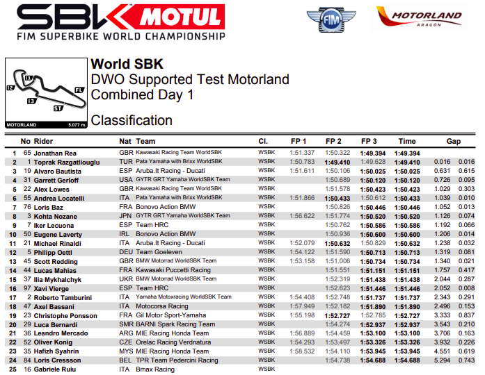 Desde el cuarto lugar quedó el estadounidense Garrett Gerloff a +726 (1:50.120) y cerrando en el quinto puesto fue el compañero de Jonathan Rea, Alex Lowes con 1:50.423 (+1.029).