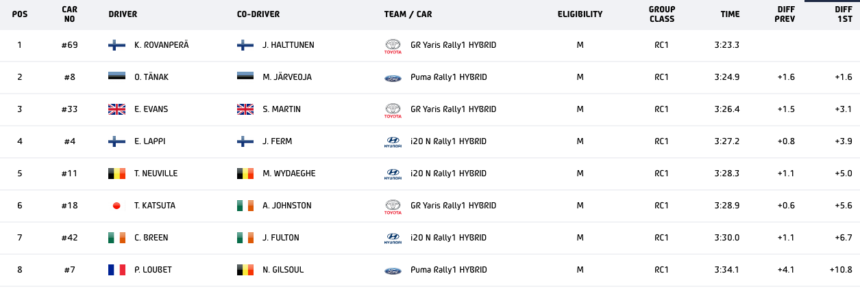 Por otro lado el clasificador de la RC1 cerró con Takamoto Katsuta a +5.6, Craig Breen +6.7 y en el octavo puesto quedó el francés Pierre-Louis Loubet a +10.8.