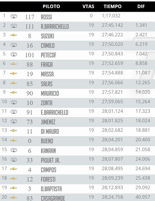 A falta de cincos vuelta el brasileño con el Toyota No.29 se pasaba de largo y perdía la chance de buscar el tercer lugar de carrera. Seguido Pernía sacaba más ventajas sobre su compañero de equipo Fineschi, para dejar el 1-2 de AXION energy Sport.