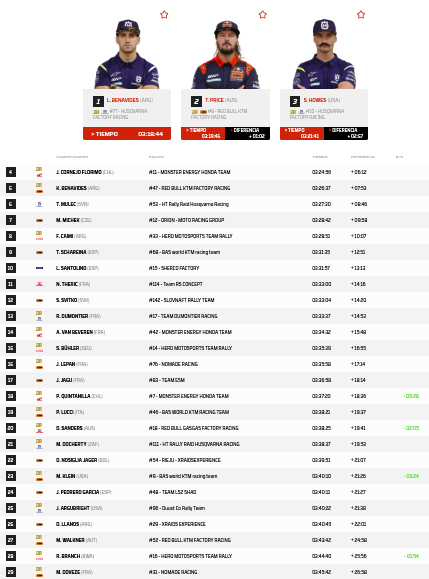 Por otro lado, los cincos mejores de la novena etapa quedó con los pilotos de latinoamericano, hablamos de Jose Ignacio Cornejo Florimo a +6:12 y quinto Kevin Benavides con 3:26.37.