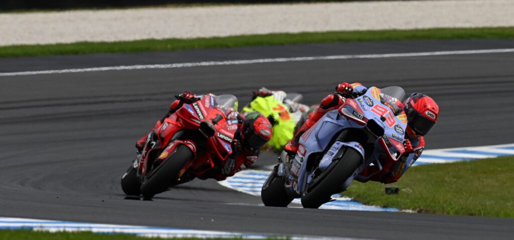Victoria demoledora para Marc Márquez en el Gran Premio de Australia, luego de haber tenido un comienzo difícil con la Ducati de Gresini Racing N°93. Ya que tuvo una pegatina pegada en el neumático que lo complicó tener agarre en pista.