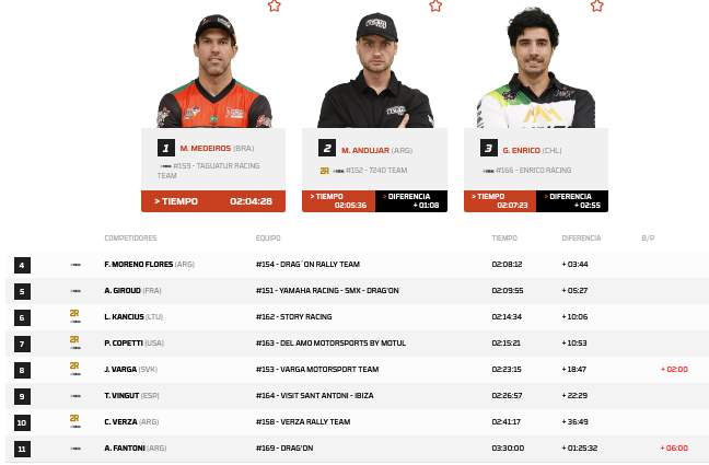 Los cuatriciclos pasaron por su etapa y han tenido como protagonista al piloto de Brasil, Marcelo Medeiros luego de haber sacado una mínima diferencia sobre los pilotos argentinos.