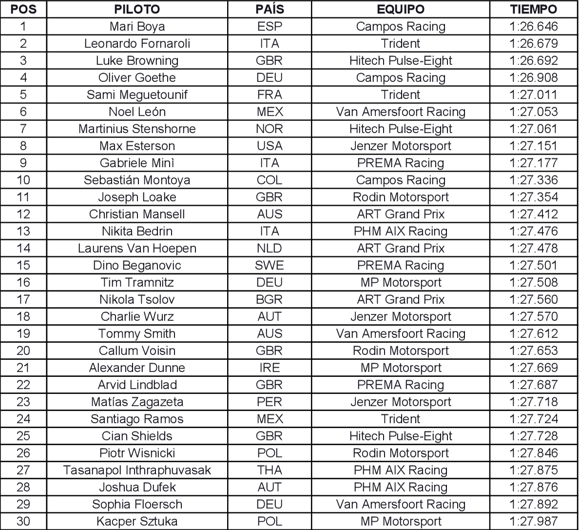 Los cincos primeros por su lado quedó con el alemán, Oliver Goethe de Campos Racing con 1:26.908 y quinto concluyó Sami Meguetounif con la estructura Trident que marcó 1:27.011.