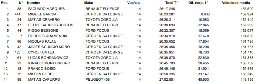 El líder de la carrera, Facundo con el Renault Fluence se puso con el récord de pista de 1:22.231 para poder alejarse del segundo. Luego en la lucha del 3er puesto tuvo a Cravero superando a Barrios Bustos con un lindo sobrepsao.