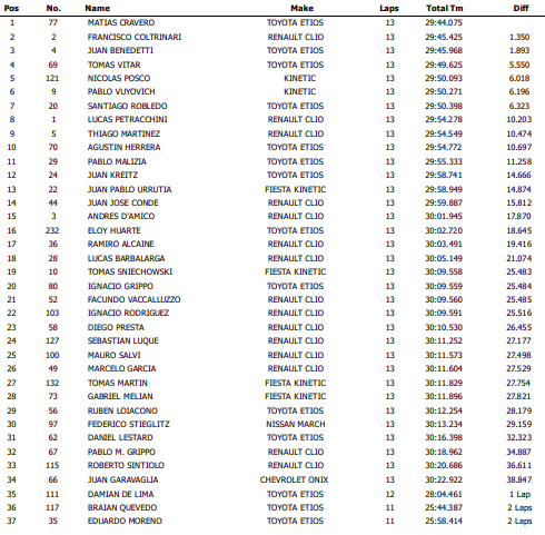 Junto al ZP Sport logró imponerse desde la largada que fue retrasada por el problema de Federico Stieglitz. Cabe destacar que se descontó una vuelta de la final.