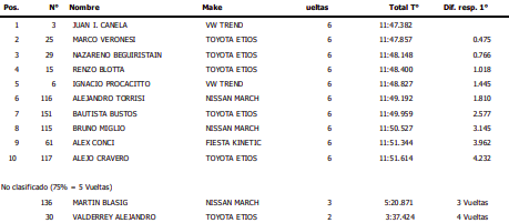 Aunque también Cravero tuvo apercibido luego de haber tenido un roce con Sergio Fernandez, que al final debió abandonar por problemas mecánicos. El top 3 de la serie dejó a Christian Abdala junto a Maximiliano Bestani que subió por el recargo a Facundo Bustos.