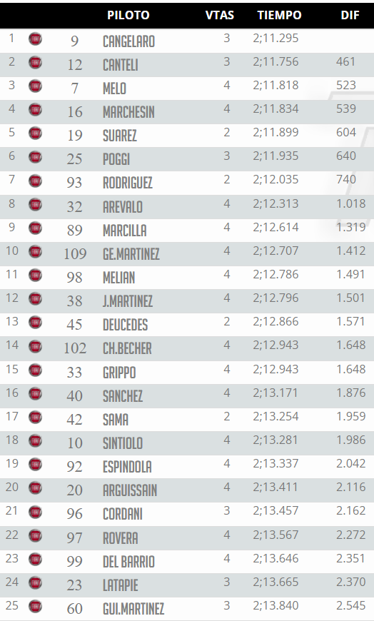 Cangelaro logró cerrar el viernes con un tiempo de 2:11.295, sacando una buena diferencia con respecto a sus rivales en una increíble qualy que tuvo la Clase Uno. Donde uno de los máximos ganadores de la temporada logró remarcar su nivel.