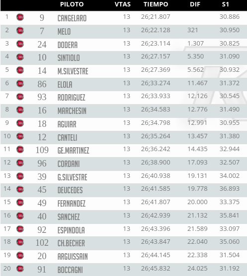 Latapie y Martínez por su lado tenían problemas en la última vuelta de la competencia, donde la lluvía se convertía como protagonista. Llegando a las últimas curvas Cangelaro lograba recuperar la punta, tras una gran maniobra sobre Melo.