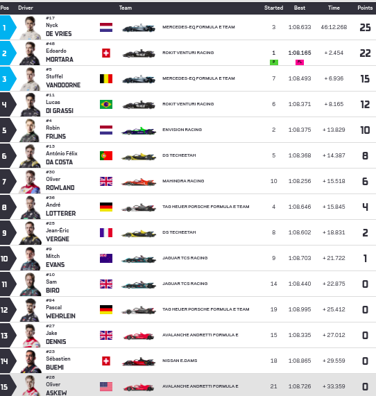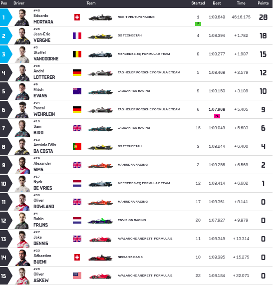 El podio de la carrera tuvo aparte de De Vries a Mortara y su compañero de equipo, Stoffel Vandoorne. Mientras que los cincos mejores cerró con Lucas Di Grassi y Robin Frijns.