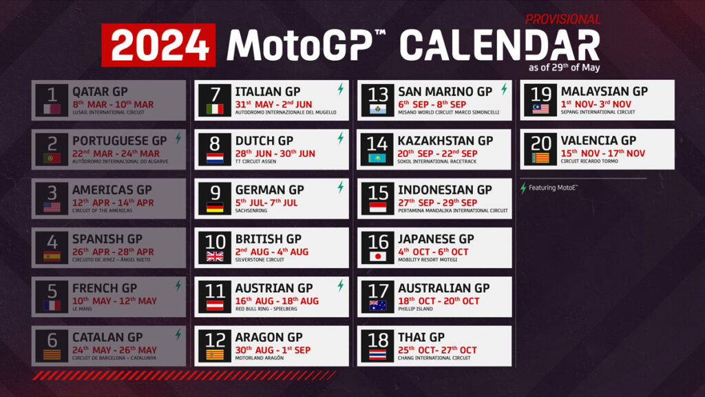 Por otro lado FIM, Dorna e IRTA anunciaron que el Gran Premio de la India no se celebrará en 2024, ya que la categoría reina pospuso dicha fecha para el próximo año, debido a la consideraciones operativas.