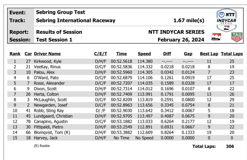 Los tres primeros de la general son Christian Lundgaard que quedó con 52.1065 y un total de 53 giros. Tercero por su lado tuvo a Josef Newgarden que con el Penske se metió con 52.1298 con 75 vueltas en Sebring.