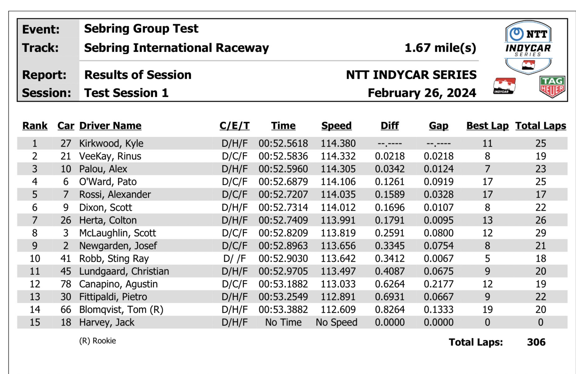 El actual y dos veces campeón de la serie Palou lideró el primer día de una prueba de dos días el 26 de febrero en el circuito corto del Sebring International Raceway, logrando una vuelta máxima de 52.0883 segundos en el No. 10 DHL Chip Ganassi Racing Honda. Las pruebas se dividieron en sesiones de mañana y tarde, y la mejor vuelta de Palou se produjo por la tarde en un circuito notoriamente lleno de baches y desafiante.